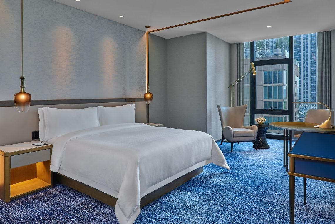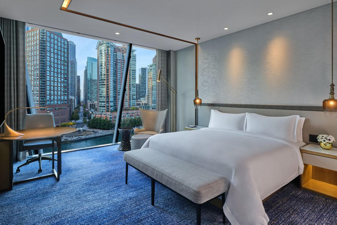 Indulge in refined elegance with sweeping views of the Chicago River, a sumptuous king bed draped in the finest linens, and a marble sanctuary bathroom featuring a deep soaking tub and rainfall shower.